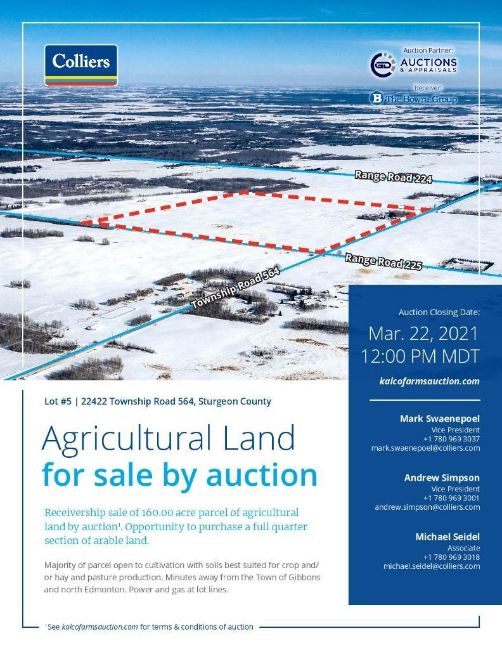 GD Auctions & Appraisals in Conjunction with Colliers is excited to bring you the Kalco Farms Ltd. Unreserved Timed Online Real Estate Auction. Featuring 10 Agriculture Land Lots including a complete Grain Handling operation as well as 3 Lots with Homesteads.