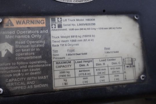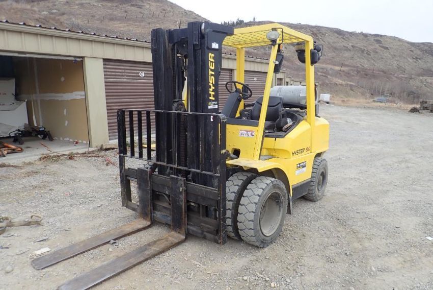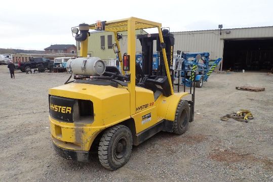 Hyster H80XM 8,000lbs Capacity LPG Forklift w/ 3-Stage Mast, Side Shift, 173.8" Max. Lift Height, 7.00x15 Dual Pneumatic Front Tires, 7.00x12 Pneumatic Rear Tires, Showing 45hrs. **NOTE: BEING USED FOR LOADOUT, CANNOT BE REMOVED UNTIL 3PM DEC 1/21**