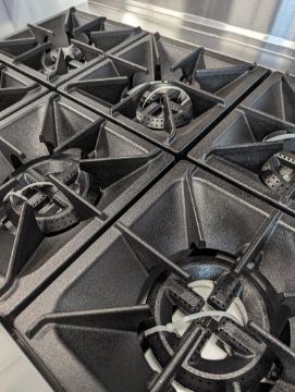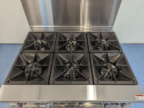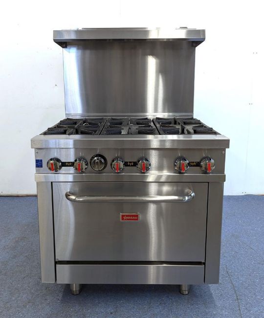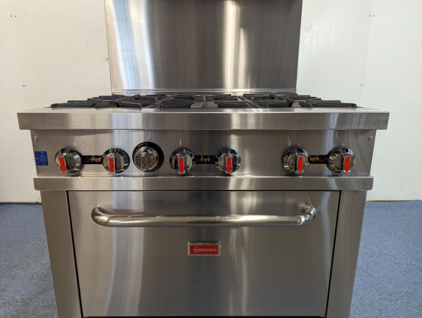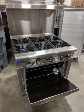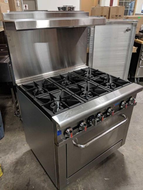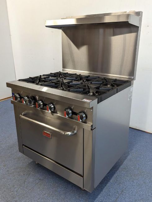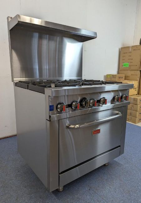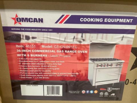 NEW 36" COMMERCIAL GAS RANGE, LIQUID PROPANE - OMCAN 46151 - NEW. OVEN CAPACITY: 5.58 CU. FT. 30,000 BTU PER BURNER / 31,000 BTU PER OVEN, OVEN TEMPERATURE: 250°F – 550 °F / 121 °C – 288 °C