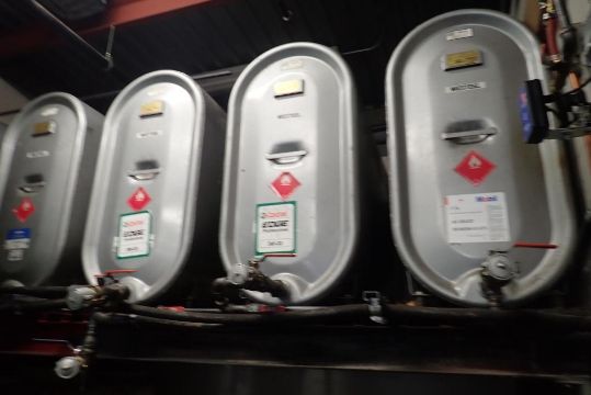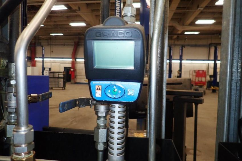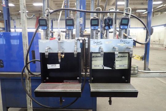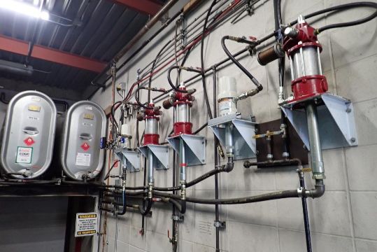 Graco Fluid Dispensing System inc. (5) Graco 1500psi Dispensing Guns, (5) Graco Pumps, (5) Westeel 1,135L Steel Tanks and Poly Tank.
