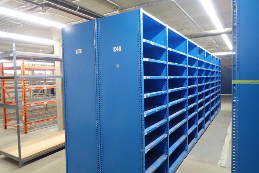 Lot of (6) Sections 88"x42"x24" Rousseau Metal Warehouse Shelving, (8) Sections 88"x36"x24" Rousseau Metal Warehouse Shelving and (2) Sections 88"x30"x24" Rousseau Metal Warehouse Shelving.