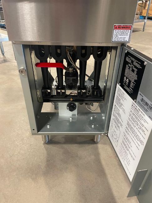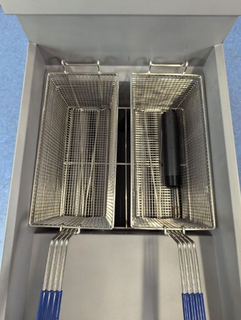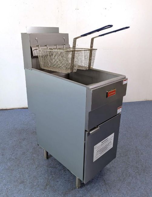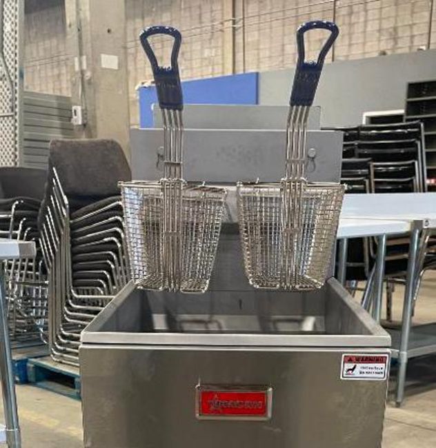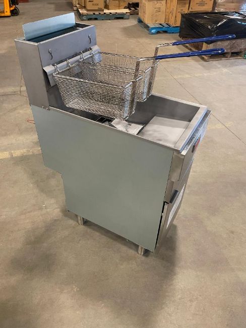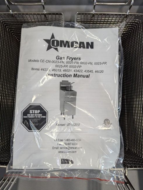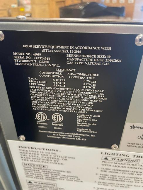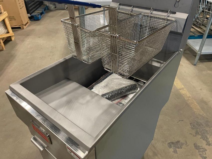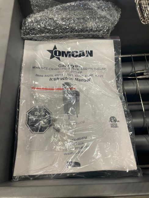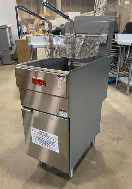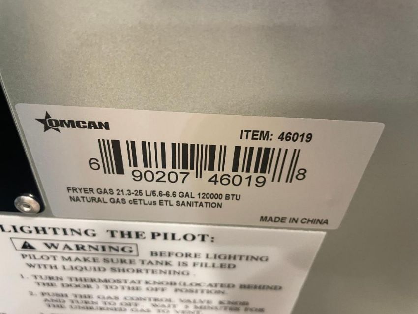 50LB NATURAL GAS FLOOR FRYER, 120K BTU, OMCAN 46019. NATURAL GAS, INPUT: 120K BTU, THERMOSTAT TEMP: 200°F – 400°F