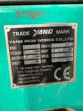 1999 Yang FG-25 LPG Forklift, 5,000lb. Capacity, Hrs N/A